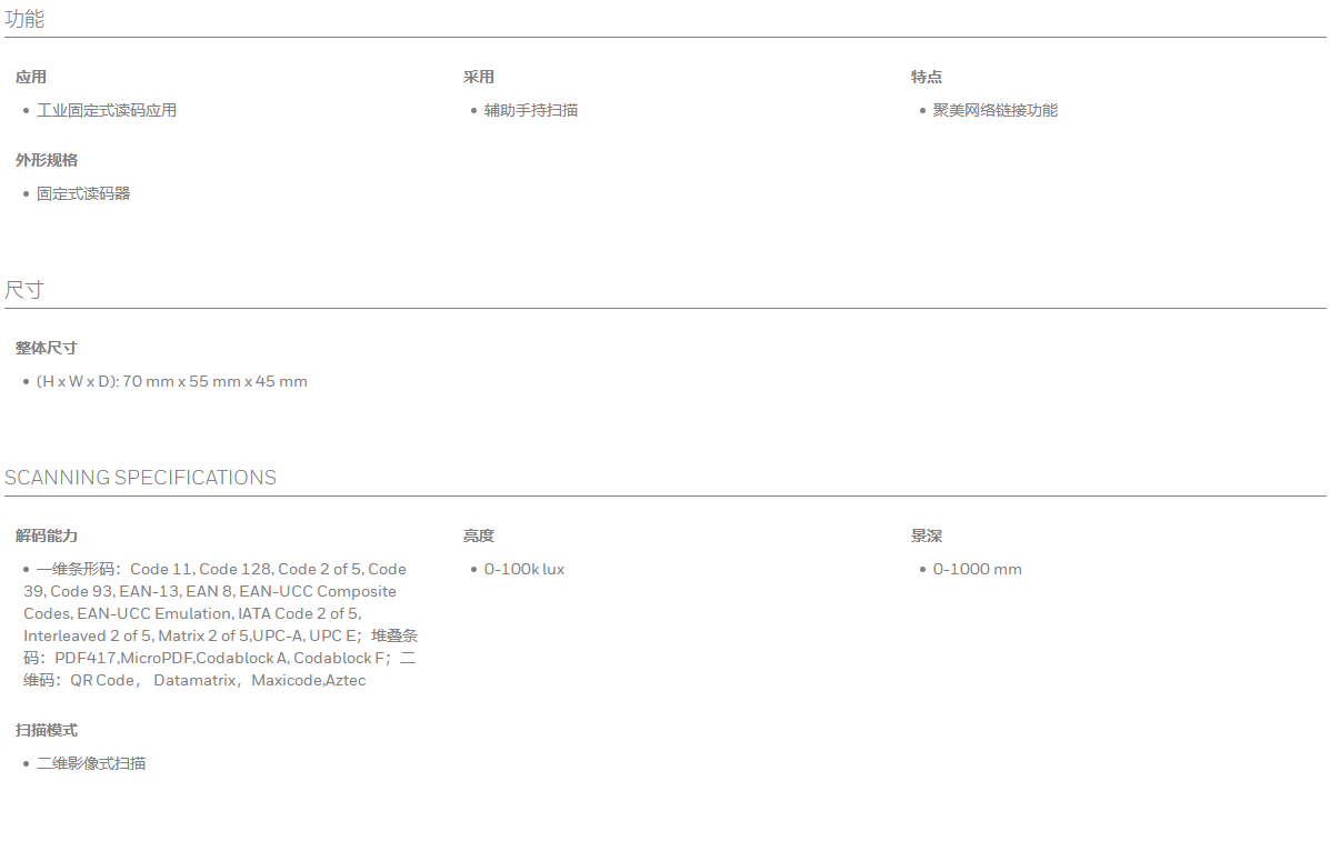 搭載200萬像素圖像傳感器,50萬/130萬像素掃描解碼輸出,采集幀率為100fps, 結(jié)合高速運算的處理芯片,再加上霍尼韋爾行業(yè)領(lǐng)先的解碼算法,極大地提高了產(chǎn)線數(shù)據(jù)采集效率