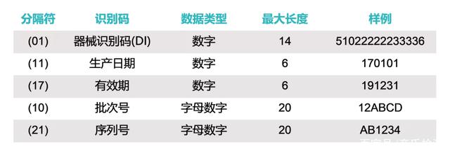 主要是一個由數字或字母組成的編碼。由器械識別碼(DI)和生產識別碼(PI)組成。