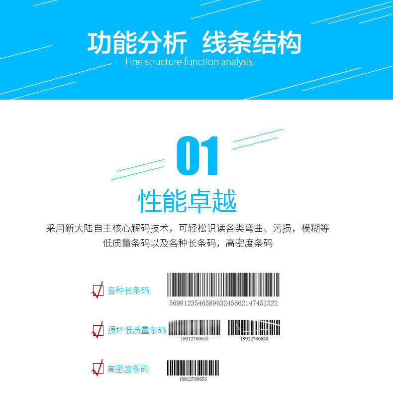 采用新大陸自主核心解碼技術,可輕松識讀各類彎曲、污損,模糊等低質量條碼以及各種長條碼,高密度條碼。